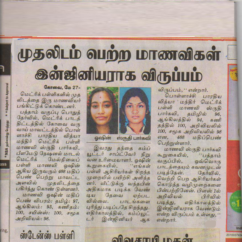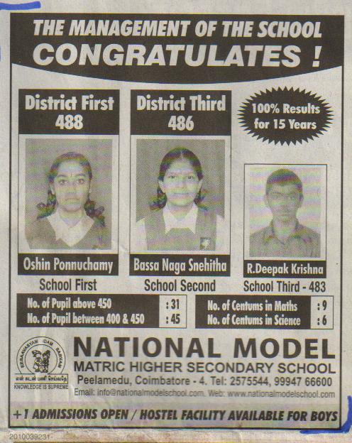 " A Student's achievement is a team work of teachers, family, school, friends, etc. Thus I(OshinPonnuchamy) achieved "First Rank" in Coimbatore District in tenth matric board exam. I feel this achievement is mainly by the contribution of my teachers. I wish to "Thank" my teachers for this success"