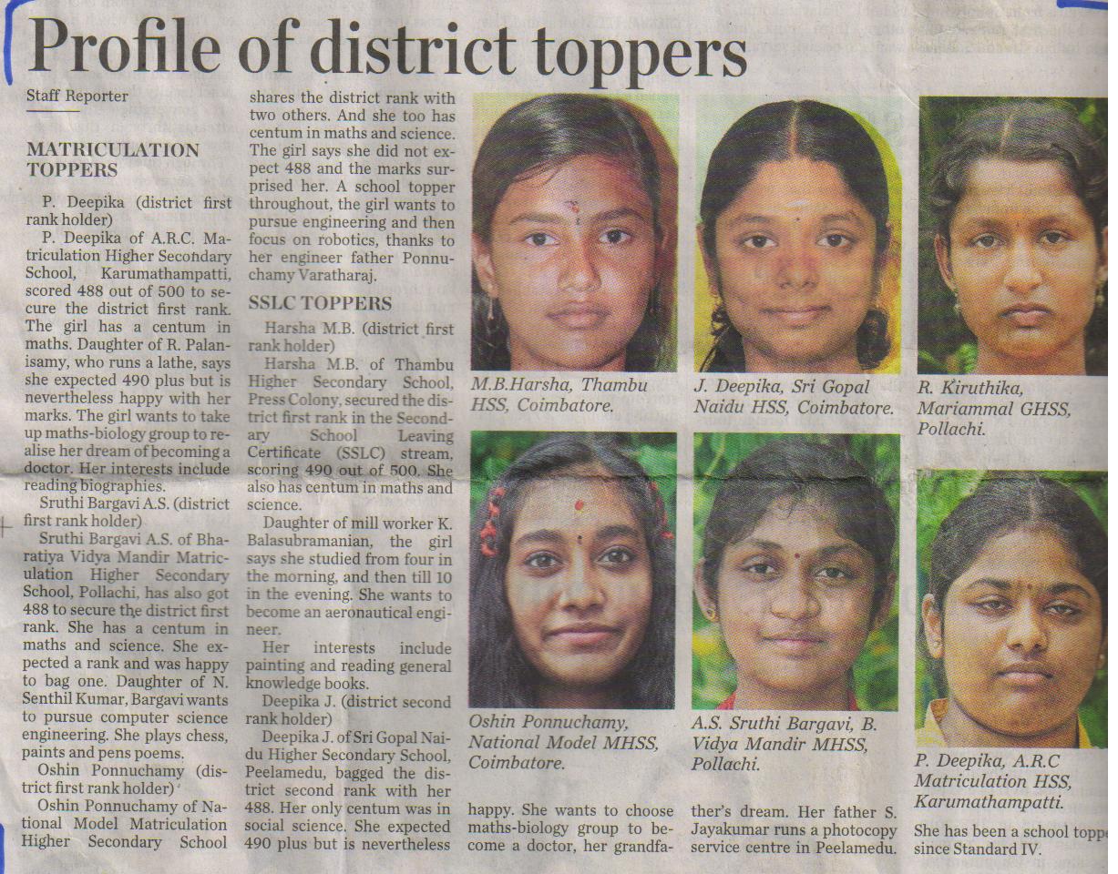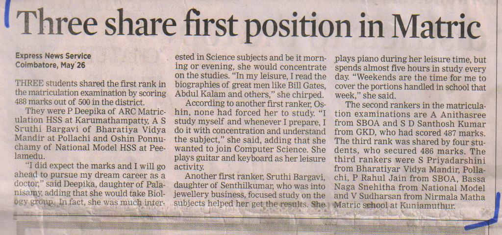 " A Student's achievement is a team work of teachers, family, school, friends, etc. Thus I(OshinPonnuchamy) achieved "First Rank" in Coimbatore District in tenth matric board exam. I feel this achievement is mainly by the contribution of my teachers. I wish to "Thank" my teachers for this success"